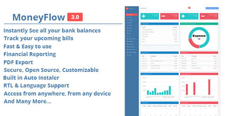 شاید دوست داشته باشید مدیریت حساب ها و سیستم حسابداری خود را در هر جایی از اینترنت فراهم کنید! هم اکنون با اسکریپت MoneyFlow قادر هستید براحتی یک نرم افزار حسابداری آنلاین (تحت وب) به زبان PHP راه اندازی کنید و سامانه حسابداری خود را آنلاین مدیریت کنید. این سیستم با ارائه ابزار های دقیق و کاربردی قادر است نیاز های شما را در رابطه با مدیریت حساب ها رفع کند. از قابلیت های این سیستم می توان به امکان مدیریت موجودی بانک ها ، قابلیت پیگیری و نمایش صورت حساب ها و پرداختی ها ، قابلیت نمایش وضعیت دریافتی ها ، سیستم گزارش گیری دقیق و کارآمد ، قابلیت دریافت خروجی PDF ، سیستم نصب کننده اتوماتیک و ساده ، قابلیت دسترسی به سیستم از هر کجا و هر ابزاری (موبایل ، تبلت و یا کامپیوتر) به وسیله اینترنت اشاره نمود. همچنین این سیستم دارای نسخه ی راست چین شده (RTL) و همچنین چند زبانه می باشد.