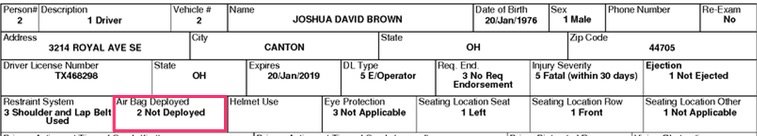 جاشوا براون 40 ساله که در اتوبان فلوریدا در سوار تسلا مدل S خود بود و آن را در حالت رانندگیخودکار قرار داده بود دچار حادثه شد. بر اساس گزارش پلیس یک کامیون از سمت چپ به این خودرو نزدیک میشود و خودرو به فضای خالی زیر کامیون میرود. پلیس احتمال میدهد به دلیلی زاویه تابش آفتاب سنسورهای این خودرو متوجه کامیون نمیشود و پس از برخورد سقف تسلا کاملا له میشود اما خودرو باز هم از حرکت نمیایستد و پس از این برخورد شدید به را خود ادامه میدهد و با فنسهای کنار جاده برخورد میکند و سپس تیر برق مانع ادامه حرکت خودرو میشود.