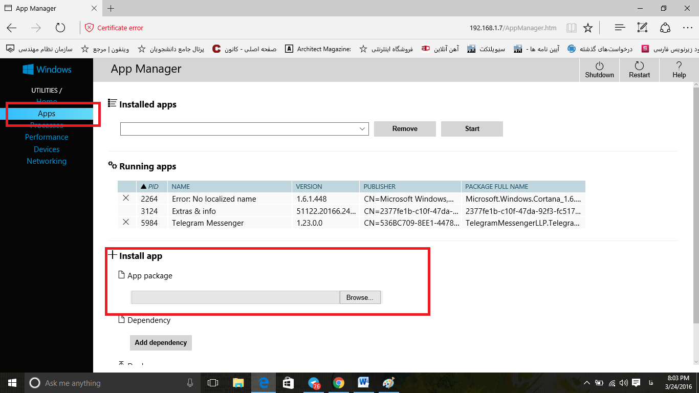 - در اینجا کافیست از نوار ابزار سمت چپ Apps را انتخاب کرده و سپس فایل برنامه مورد نطر را بارگذاری(Upload) کنید